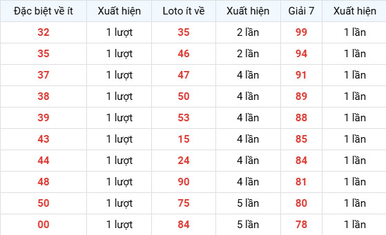 • Các số: 32, 35, 37, 38, 39, 43, 44, 48, 50, 00 đều xuất hiện 1 lượt