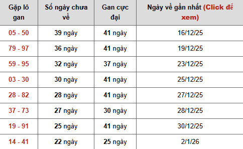 Nổi bật nhất là cặp 05 – 50, hiện đã 39 ngày chưa xuất hiện, chỉ còn cách mốc gan cực đại 41 ngày đúng 2 ngày, lần về gần nhất ghi nhận 16/12/2025. Trạng thái gan cận đỉnh kéo dài cho thấy áp lực giải tỏa đang ở mức rất cao, khiến cặp số này trở thành tâm điểm cần cân nhắc trong các phương án dự đoán xổ số miền bắc ngày 25/1/2026 chuẩn xác trọng điểm.