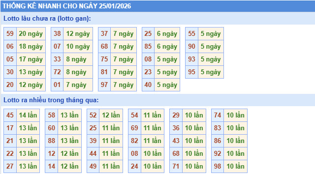 Thống kê cặp lô gan XSMB ngày 25/1/2026