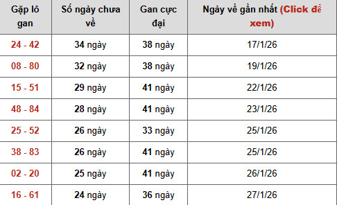 Nổi bật nhất hiện là cặp 24 – 42, đang đạt 34 ngày chưa về trên nền gan cực đại 38 ngày, khoảng cách tới đỉnh lịch sử không còn lớn. Trạng thái gan cao kéo dài cho thấy áp lực giải tỏa đang tăng dần, khiến cặp này trở thành điểm cần chú ý trong các kịch bản dự đoán xổ số miền bắc ngày 25/2/2026 chuẩn xác.