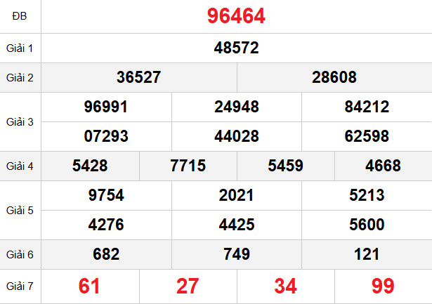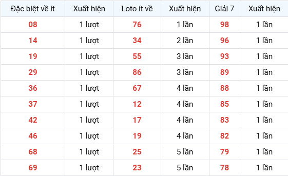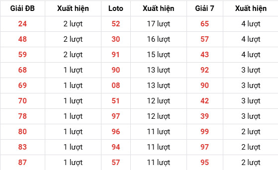 Bảng gồm 3 nhóm chính: Giải ĐB (đặc biệt), Loto, và Giải 7 kèm số lần xuất hiện.