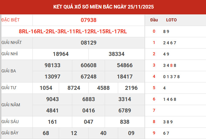 Ngày 25/11/2025, giải đặc biệt của Xổ số Miền Bắc thuộc về dãy số 07938, trong đó cặp 38 là tâm điểm dành cho những ai quan tâm tới các dấu hiệu lặp lại.