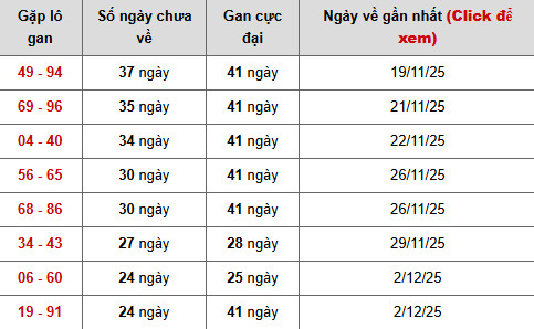Cặp 49 – 94 đang trải qua 36 ngày chưa xuất hiện, trong khi mức gan cực đại ghi nhận là 41 ngày, lần nổ gần nhất vào 19/11. Trạng thái này cho thấy gan đã rơi vào vùng rất sâu, áp lực giải tỏa lớn và cần được ưu tiên theo dõi khi dự đoán xổ số miền bắc ở những kỳ sắp tới.