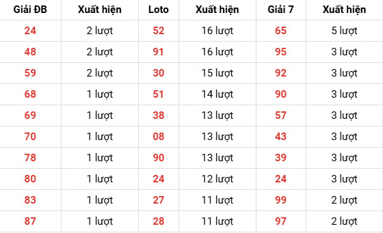 24, 48, 59 (2 lượt) → tiếp tục là nhóm có tần suất cao nhất, duy trì sự ổn định.