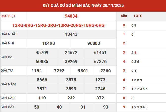 Ngày 28/11/2025, giải đặc biệt của Xổ số Miền Bắc thuộc về dãy số 94834, trong đó cặp 34 là tâm điểm dành cho những ai quan tâm tới các dấu hiệu lặp lại.