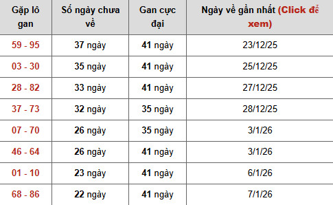Nổi bật nhất là cặp 59 – 95, hiện đã 37 ngày chưa xuất hiện, trong khi mốc gan cực đại đạt 41 ngày. Khoảng cách còn lại không lớn cho thấy trạng thái gan rất cao, áp lực giải tỏa mạnh; lần về gần nhất ghi nhận 23/12/2025, đủ độ giãn để cân nhắc trong các phương án dự đoán xổ số miền bắc ngày 30/1/2026 chuẩn xác.