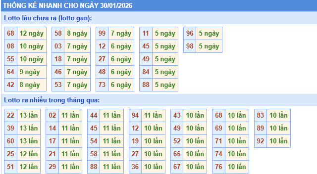​Thống kê lô tô miền Bắc nhanh ngày 30/1/2026
