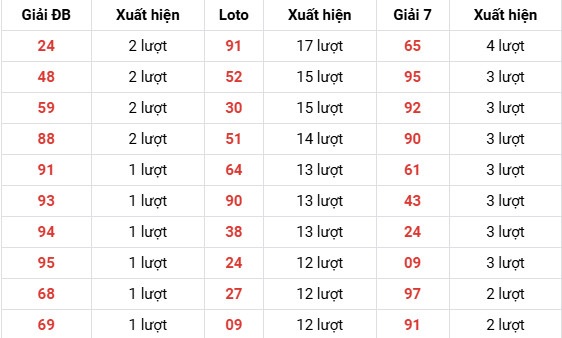 91 (17 lượt) → dẫn đầu toàn bảng, có chu kỳ lặp rất mạnh.