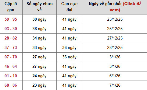Thống kê cặp lô gan XSMB ngày 31/1/2026