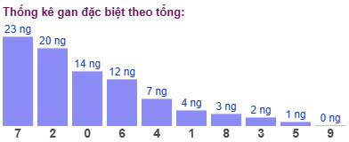 Thống kê cho thấy tổng đề lâu chưa xuất hiện nhất là tổng 7 (bao gồm 10 cặp số: 07, 16, 25, 34, 43, 52, 61, 70, 89, 98) đã 23 ngày chưa ra.