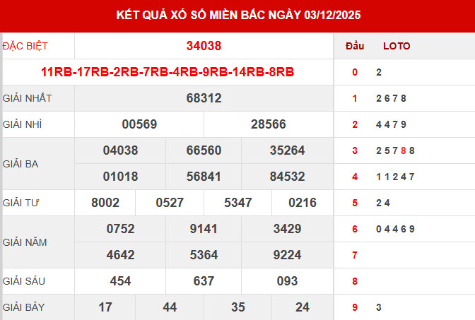Ngày 3/12/2025, giải đặc biệt của Xổ số Miền Bắc thuộc về dãy số 34038, trong đó cặp 38 là tâm điểm dành cho những ai quan tâm tới các dấu hiệu lặp lại.