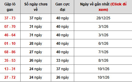 Nổi bật nhất là cặp 37 – 73, hiện đã 37 ngày chưa xuất hiện, chỉ còn cách mốc gan cực đại 40 ngày đúng 3 ngày, lần về gần nhất ghi nhận 28/12/2025. Trạng thái gan cao, tiến sát đỉnh cho thấy áp lực giải tỏa đang tăng mạnh, khiến cặp số này trở thành điểm cần cân nhắc trong các phương án dự đoán xổ số miền bắc ngày 4/2/2026 chuẩn xác.