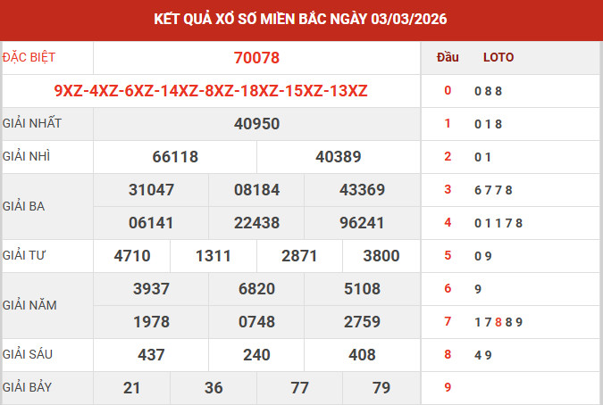 Căn cứ vào bảng kết quả xổ số miền Bắc ngày 3/3/2026 vừa được công bố, các chuyên gia tiến hành tổng hợp và phân tích các số liệu trọng tâm, qua đó mang đến những nhận định chi tiết nhằm hỗ trợ bạn đọc tham khảo và dự đoán XSMB 4/3/2026 một cách hiệu quả.