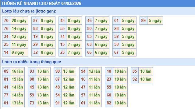 ​Thống kê lô tô miền Bắc nhanh ngày 4/3/2026