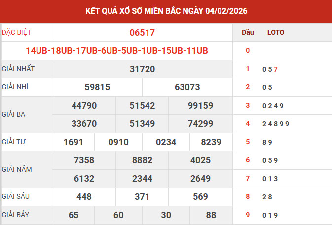 Căn cứ vào bảng kết quả xổ số miền Bắc ngày 4/2/2026 vừa được công bố, các chuyên gia tiến hành tổng hợp và phân tích các số liệu trọng tâm, qua đó mang đến những nhận định chi tiết nhằm hỗ trợ bạn đọc tham khảo và dự đoán XSMB 5/2/2026 một cách hiệu quả.