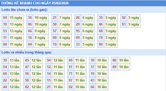 Thống kê – dự đoán XSMB ngày 5/2/2026 Thần Tài hôm nay mang đến cái nhìn tổng quan về XSMB chiều nay, tập trung vào các con số giải đặc biệt, lô có tần suất xuất hiện cao và lâu chưa về sau nhiều kỳ quay. Đây là cơ sở quan trọng để bạn đọc tham khảo khi theo dõi dự đoán XSMB 5/2 và lựa chọn bộ số phù hợp.