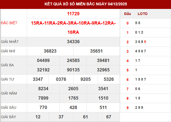 Ngày 5/12/2025, giải đặc biệt của Xổ số Miền Bắc thuộc về dãy số 11729, trong đó cặp 29 là tâm điểm dành cho những ai quan tâm tới các dấu hiệu lặp lại.