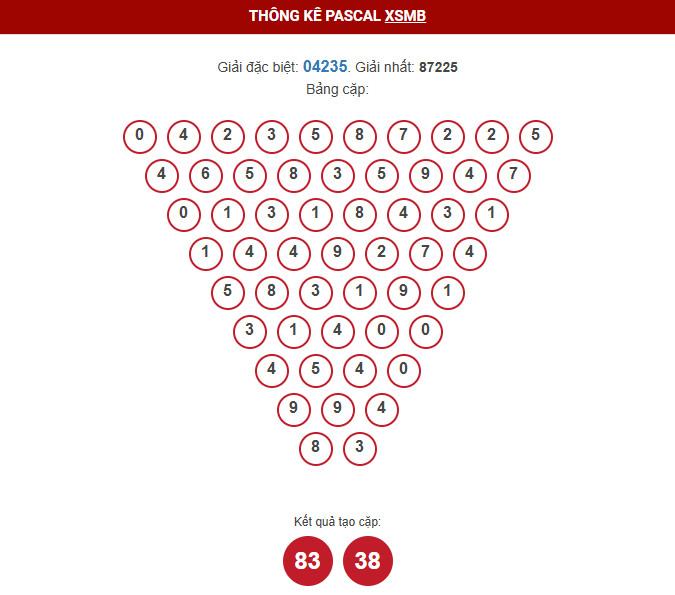 - Dựa vào thống kê Pascal, tham khảo cặp số đặc biệt dễ ra : 83 - 38