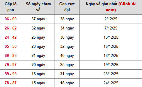 Nổi bật nhất là cặp 06 – 60, hiện đã 37 ngày chưa xuất hiện, chỉ còn cách mốc gan cực đại 38 ngày đúng 1 ngày, lần về gần nhất ghi nhận 02/12/2025. Trạng thái gan cận đỉnh kéo dài cho thấy áp lực giải tỏa đang ở mức rất cao, khiến cặp số này trở thành tâm điểm cần đặc biệt cân nhắc trong các phương án dự đoán xổ số miền bắc chuẩn xác.