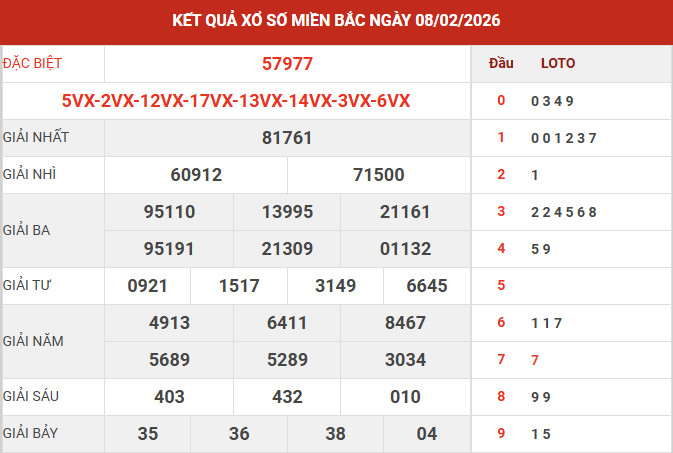 Căn cứ vào bảng kết quả xổ số miền Bắc ngày 8/2/2026 vừa được công bố, các chuyên gia tiến hành tổng hợp và phân tích các số liệu trọng tâm, qua đó mang đến những nhận định chi tiết nhằm hỗ trợ bạn đọc tham khảo và dự đoán mùng XSMB 9/2/2026 một cách hiệu quả.