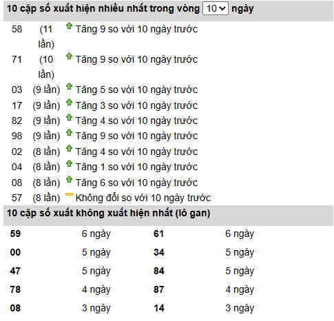 Qua bảng thống kê 10 ngày gần nhất, 58 đang là cặp số dẫn đầu tần suất khi đạt 11 lần xuất hiện, đồng thời ghi nhận mức tăng rất mạnh +9 so với chu kỳ trước. Ngay phía sau là 71 với 10 lần và mức tăng tương đương +9, cho thấy hai cặp số này đang vào nhịp chạy cao, giữ vai trò trụ và rất phù hợp đặt trung tâm trong các dàn soi cầu xổ số miền nam ngày 10 tháng 1 năm 2026.