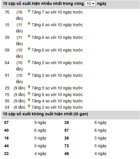 Qua bảng thống kê 10 ngày gần nhất, 76 đang vươn lên dẫn đầu với 16 lần xuất hiện, kèm mức tăng mạnh +7, cho thấy nhịp chạy rất cao và đóng vai trò trụ ngắn hạn. Theo sau là 15 và 39 cùng đạt 11 lần (đều tăng +6), phản ánh đà tăng đồng thuận và khả năng duy trì tần suất tốt. Nhóm 09 – 64 – 91 đạt 10 lần, trong đó 09 và 91 tăng mạnh (+6, +5), củng cố trạng thái chạy bền. Lớp kế tiếp gồm 29 – 75 – 95 (9 lần) và 04 (8 lần) vẫn giữ nhịp ổn định, phù hợp làm khung dàn cho các phương án soi cầu xổ số miền nam ngày 11 tháng 2 năm 2026 và mở rộng lựa chọn trong dự đoán xổ số miền nam 11/2/2026 chuẩn xác.