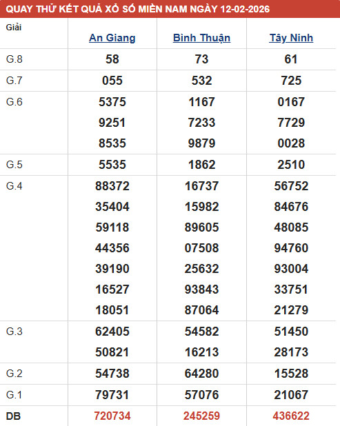 Dự đoán XSMN ngày 12/2/2026 - Thống kê XSMN thứ 5 tối nay - Cùng các chuyên gia phân tích các đài XSAG - XSTN - XSBTH mở thưởng ngày 12/2/2026.
