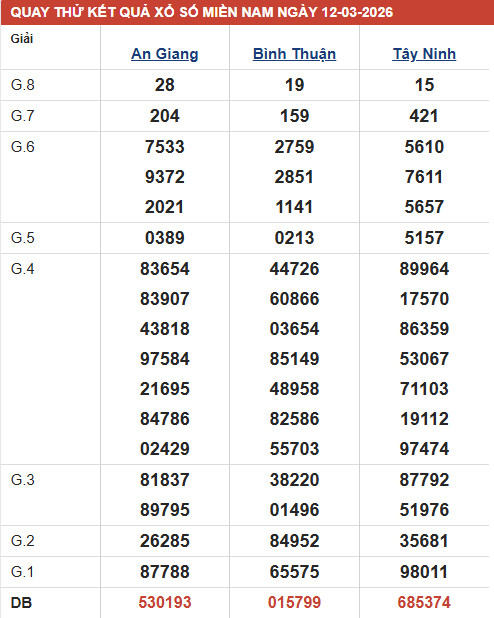 Dự đoán XSMN ngày 12/3/2026 - Thống kê XSMN thứ 5 tối nay - Cùng các chuyên gia phân tích các đài XSAG - XSTN - XSBTH mở thưởng ngày 12/3/2026.