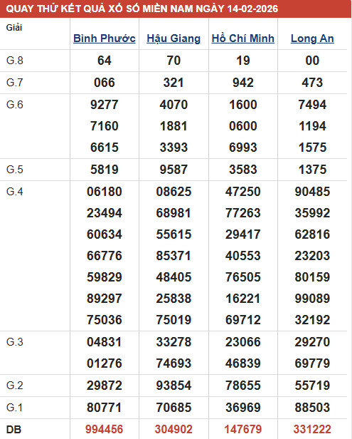 Hôm nay, chuyên trang sxmb.vn sẽ đưa ra những dự đoán XSMN ngày 14/2/2026 chính xác. Cùng các chuyên gia dự đoán xổ số miền nam các tỉnh XSHCM - XSLA - XSBP - XSHG để tìm ra con số may mắn cho mình nhé!