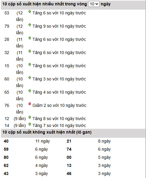 Trong bảng thống kê 10 ngày gần nhất, 53 và 79 đang cùng dẫn đầu với 12 lần xuất hiện, đồng thời ghi nhận mức tăng mạnh, đặc biệt 79 tăng tới +9. Điều này cho thấy hai mã này đang vào pha chạy cao và giữ vai trò trụ, rất phù hợp làm trung tâm khi xây dựng dàn soi cầu xổ số miền nam ngày 16 tháng 2 năm 2026.