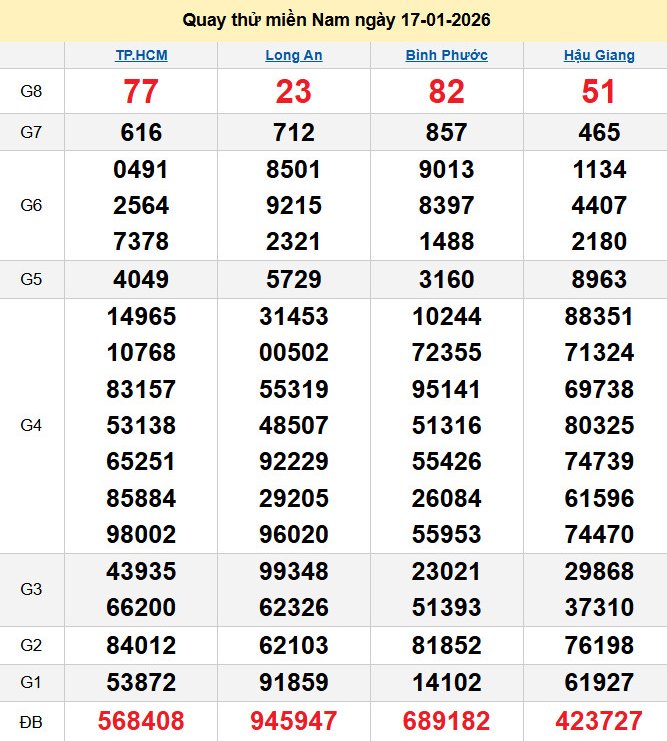 Hôm nay, chuyên trang sxmb.vn sẽ đưa ra những dự đoán XSMN ngày 17/1/2026 chính xác. Cùng các chuyên gia dự đoán xổ số miền nam các tỉnh XSHCM - XSLA - XSBP - XSHG để tìm ra con số may mắn cho mình nhé!