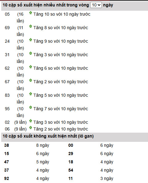 Theo sau là 69 (11 lần, +8) và 24 (10 lần, +9), phản ánh trạng thái tăng tốc rõ rệt, cho thấy nhóm số này đang được kích hoạt mạnh trong ngắn hạn.