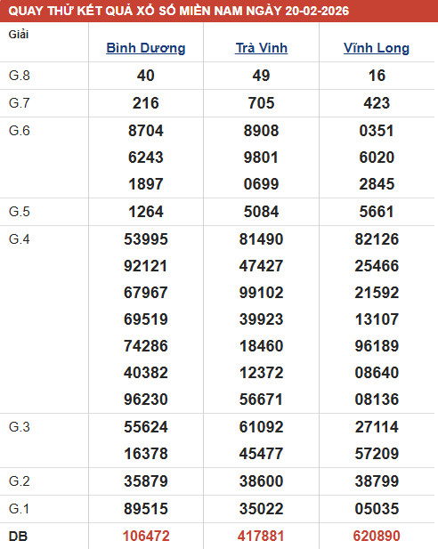 Phân tích XSMN - đài XSBD thứ 6 ngày 20/2/2026 với các mục chốt số đầu, đuôi giải đặc biệt, kết quả giải 8, lô xiên của đài xổ số Bình Dương với xác suất trúng cao
