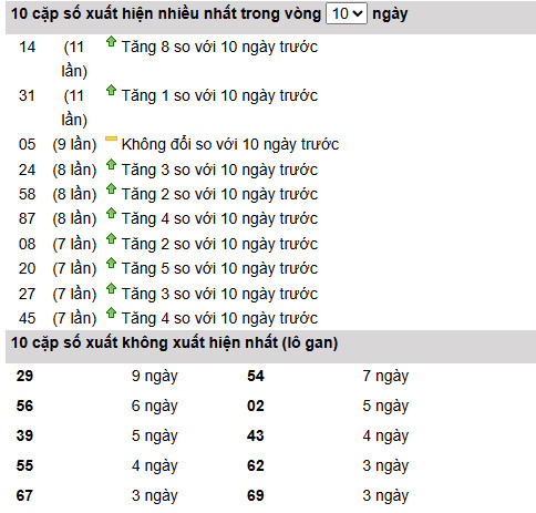 Qua bảng thống kê 10 ngày gần nhất, 14 và 31 đang dẫn đầu tần suất khi cùng đạt 11 lần xuất hiện. Trong đó, 14 tăng mạnh +8, còn 31 tăng nhẹ +1 so với chu kỳ trước. Điều này cho thấy 14 đang vào nhịp chạy rõ rệt, giữ vai trò trụ nổi bật và phù hợp đặt trung tâm trong các dàn soi cầu xổ số miền nam ngày 21 tháng 1 năm 2026.