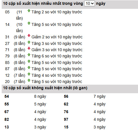 Qua bảng thống kê 10 ngày gần nhất, cặp 05 đang dẫn đầu tần suất với 11 lần xuất hiện, tăng thêm +2 so với chu kỳ trước, cho thấy dấu hiệu chạy ổn định và giữ vai trò trụ ngắn hạn. Bám sát phía sau là 14 (10 lần, +5), phản ánh nhịp tăng khá mạnh và phù hợp đưa vào trung tâm các phương án soi cầu xổ số miền nam ngày 22 tháng 1 năm 2026.