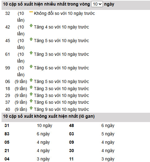 Thống kê 10 ngày gần nhất cho thấy nhóm dẫn đầu đang khá dàn trải, trong đó 32, 42, 45, 61 và 99 cùng đạt mốc 10 lần xuất hiện. Đáng chú ý, 99 và 45 có mức tăng mạnh (+6 và +5), cho thấy nhịp chạy đang vào pha tăng tốc. Đây là lớp số trụ có thể ưu tiên làm trung tâm khi triển khai các phương án soi cầu xổ số miền nam ngày 25 tháng 2 năm 2026.
