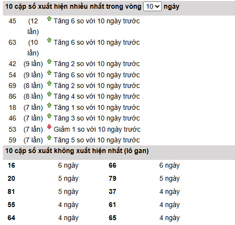 Trong thống kê 10 ngày gần nhất, 45 đang dẫn đầu với 12 lần xuất hiện, đồng thời tăng mạnh +6, cho thấy nhịp chạy rất rõ và có thể giữ vai trò trụ khi xây dựng dàn cho soi cầu xổ số miền nam ngày 1 tháng 1 năm 2026.