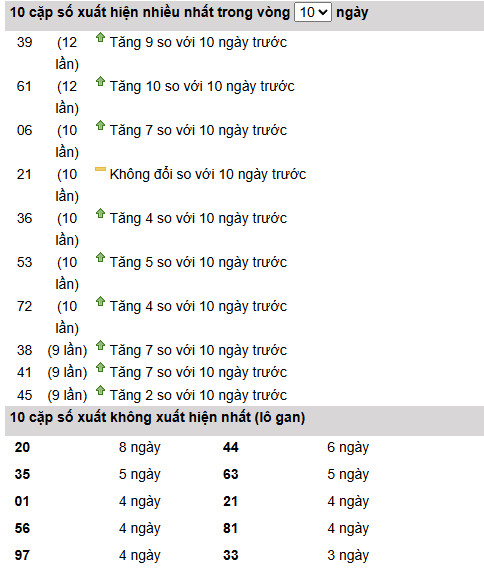 39, 61 (12 lần) → dẫn đầu, trong đó 61 (+10)39 (+9) tăng rất mạnh.