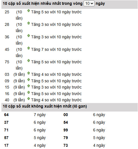 Các cặp số 25, 28, 36, 45, 75 đều đạt 10 lần xuất hiện, cho thấy xu hướng lặp lại mạnh và có khả năng tiếp tục về trong ngắn hạn.