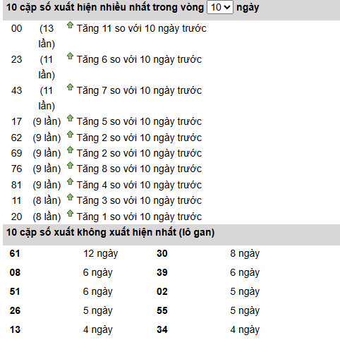 Qua bảng thống kê 10 ngày gần nhất, 00 đang giữ vị trí dẫn đầu với 13 lần xuất hiện, đồng thời ghi nhận mức tăng rất mạnh +11 so với chu kỳ trước. Theo sau là 23 và 43 cùng đạt 11 lần, trong đó 43 tăng +7, cho thấy nhóm này đang vào nhịp chạy cao, đóng vai trò trụ và phù hợp đặt trung tâm trong các phương án soi cầu xổ số miền nam ngày 1 tháng 1 năm 2026.