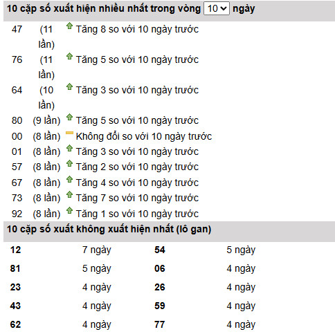 Dựa trên bảng thống kê 10 ngày gần nhất, 47 và 76 đang vươn lên dẫn đầu khi cùng đạt 11 lần xuất hiện, trong đó 47 tăng mạnh +8 và 76 tăng +5 so với chu kỳ trước. Diễn biến này cho thấy hai cặp số đang bước vào nhịp chạy cao, giữ vai trò trụ và phù hợp đặt trọng tâm khi triển khai các phương án soi cầu xổ số miền nam ngày 5 tháng 2 năm 2026.