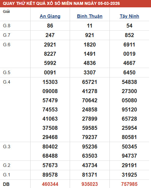 Dự đoán XSMN ngày 5/3/2026 - Thống kê XSMN thứ 5 tối nay - Cùng các chuyên gia phân tích các đài XSAG - XSTN - XSBTH mở thưởng ngày 5/3/2026.