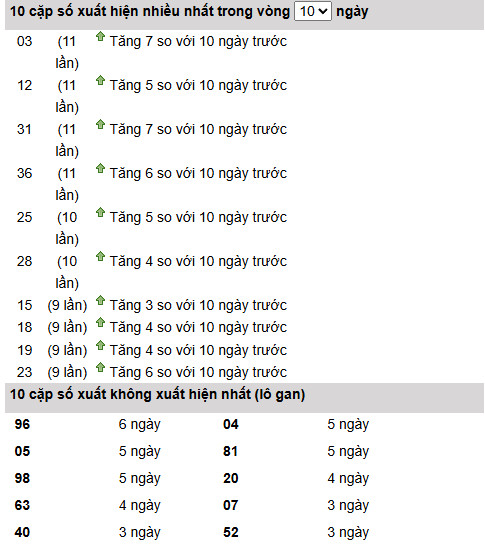 03, 12, 31, 36 (11 lần) → nhóm dẫn đầu, trong đó 03 và 31 tăng mạnh (+7), 36 tăng +6.