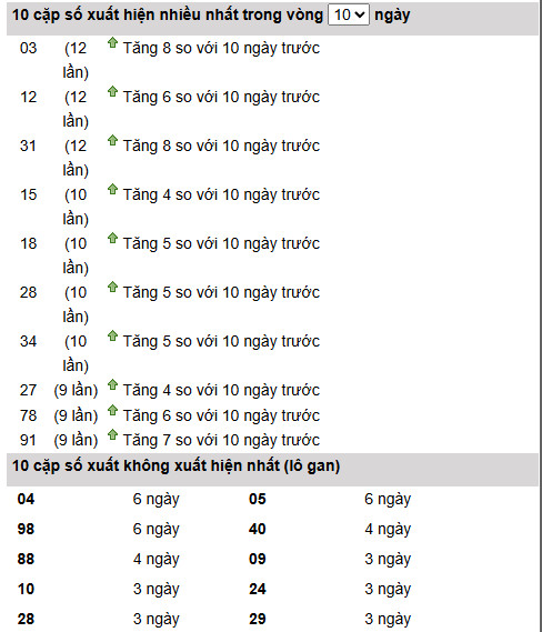03, 12, 31 (12 lần) → nhóm dẫn đầu, trong đó 03 (+8) và 31 (+8) tăng rất mạnh.