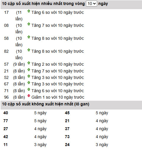 Qua bảng thống kê 10 ngày gần nhất, 17 đang là cặp số dẫn đầu khi đạt 11 lần xuất hiện, đồng thời ghi nhận mức tăng mạnh +6 so với chu kỳ trước. Đà tăng rõ rệt cho thấy 17 đang vào nhịp chạy cao, phù hợp giữ vai trò số trụ và rất thích hợp đặt trung tâm trong các dàn soi cầu xổ số miền nam ngày 7 tháng 1 năm 2026.