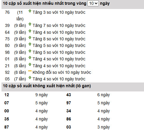 Từ bảng thống kê 10 ngày gần nhất, 76 tiếp tục giữ vị trí dẫn đầu với 11 lần xuất hiện, tăng thêm +3 so với chu kỳ trước. Điều này cho thấy 76 đang duy trì nhịp chạy ổn định và phù hợp giữ vai trò trụ khi triển khai các phương án soi cầu xổ số miền nam ngày 7 tháng 2 năm 2026.