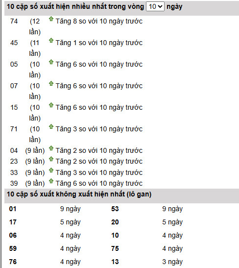 Cặp 74 dẫn đầu với 12 lần xuất hiện, đồng thời tăng mạnh 8 lần so với 10 ngày trước, cho thấy xu hướng tăng trưởng rõ rệt.