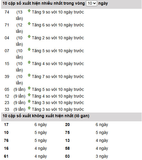 Cặp 74 dẫn đầu với 13 lần xuất hiện, đồng thời tăng mạnh 9 lần so với 10 ngày trước, cho thấy xu hướng tăng trưởng rõ rệt.