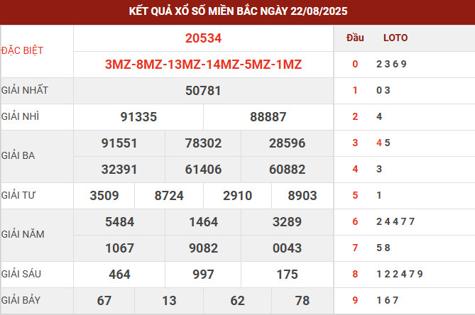 Để hỗ trợ người chơi trên con đường chinh phục giải thưởng Xổ số Miền Bắc (XSMB) ngày 23/8/2025, sxmb.vn xin gửi tới quý vị một số thông tin thống kê đáng chú ý, được tổng hợp và phân tích từ kết quả xổ số kỳ trước: