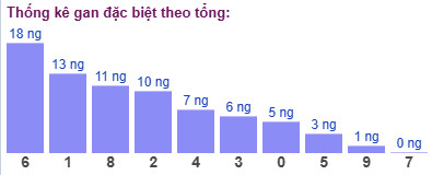 Thống kê cho thấy tổng đề lâu chưa xuất hiện nhất là tổng 6 (bao gồm 10 cặp số: 06, 15, 24, 33, 42, 51, 60, 79, 88, 97) đã 18 ngày chưa ra.